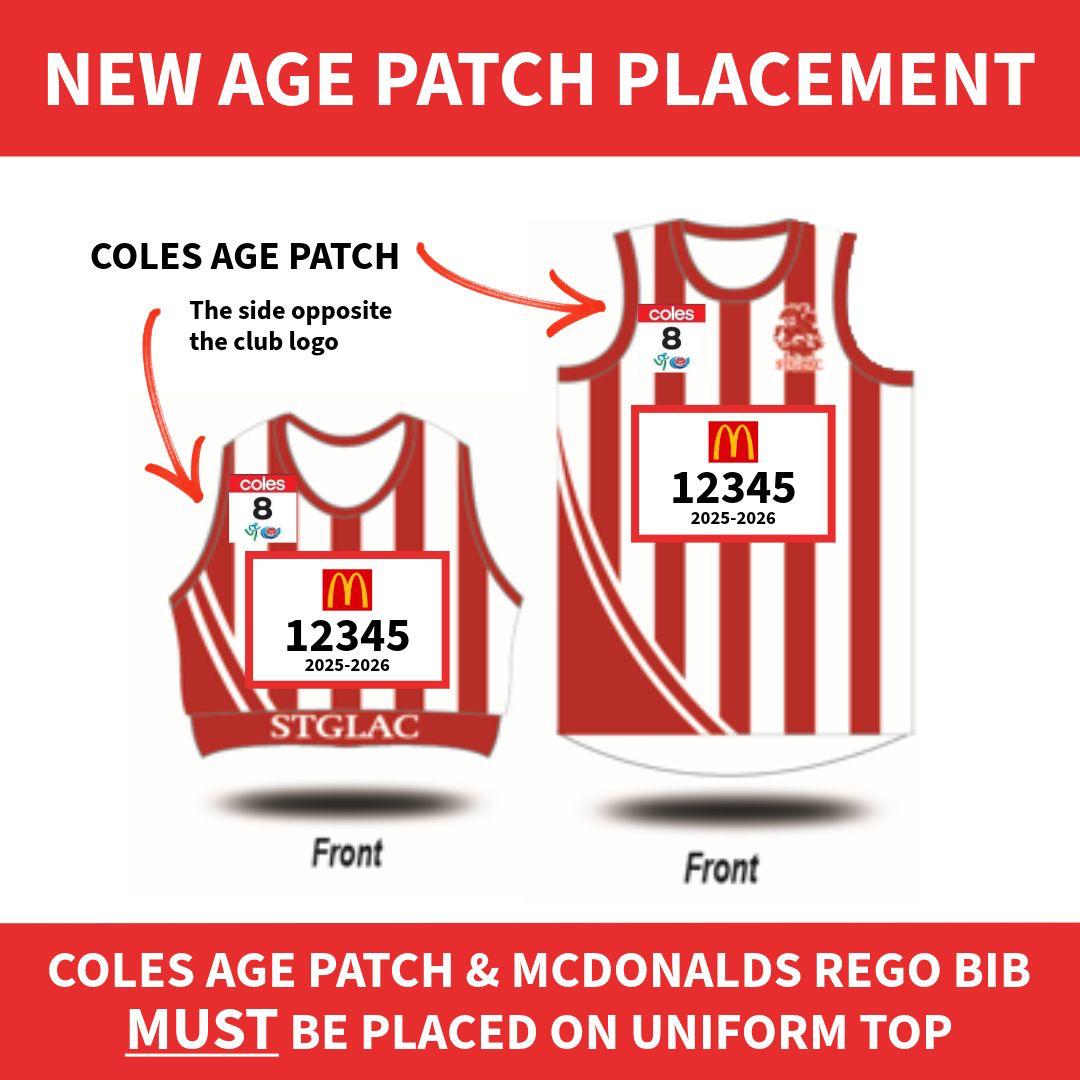 The Registration (‘Bib’) number must be attached to the centre front of tops. The Age Patch (incorporating the Coles logo) must be attached to the top – on either the left or right side. It may partially overlap the Bib – if necessary (eg. small size crop top) – but must not cover any part of the McDonalds “M”, the Bib number, Season Year, or the St George logo.